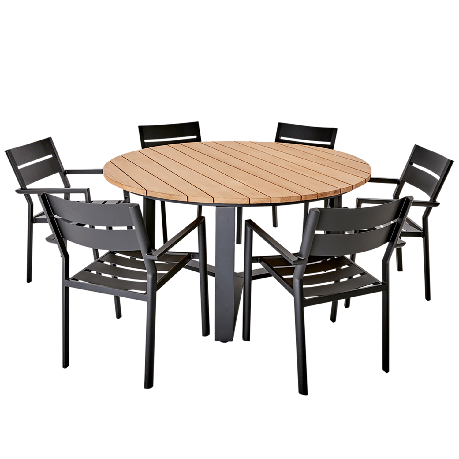 Delia/Laurion matgrupp svart/teak - 6 karmstolar - Ø150 cm