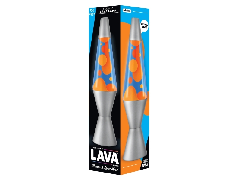 LAVA® - Lava Lampa 2117, orange vax, blå vätska, silverfärgad bas och topp, original 14,5 tum LAVA® märke rorelse lampa