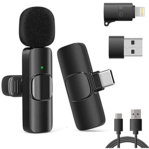 BYbrutek Uppgraderad 3-i-1 trådlös Lavalier-mikrofon med en justerbar krage-klämma och adapter – Kompatibel med iPhone/Android/dator – minimikrofon för videoinspelning/podcasts, brusreducerande