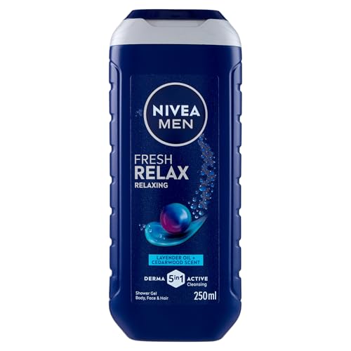 NIVEA MEN Fresh Relax Schampo Dusch 250 ml, 3-i-1 herrduschkräm för ansikte, kropp och hår, herr duschkräm med lavendelolja och cederträ, lugnande parfym, alla hudtyper