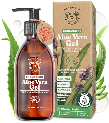 EKOLOGISKT ALOE VERA GEL | Tillverkat med 100% Rent Fruktkött av Färsk Aloe och innehåller även Ekologisk Eterisk Lavendelolja | Ansikte, Ögonkontur, Kropp, Hår | Glasflaska + Pump (200ml)
