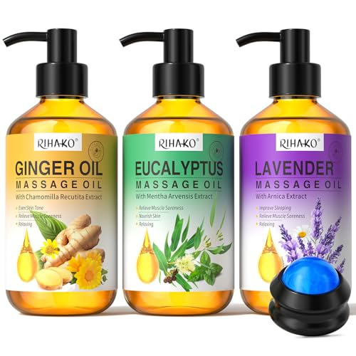 Set med massageoljor, ingefäraolja, lavendelolja, eukalyptusolja och en massageboll för en dejt, Set med massageoljor för en dejt Set med massageoljor för massage,3x100ml