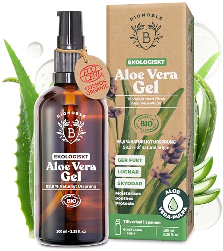 EKOLOGISKT ALOE VERA GEL | Tillverkat med 100% Rent Fruktkött av Färsk Aloe och innehåller även Ekologisk Eterisk Lavendelolja | Ansikte, Ögonkontur, Kropp, Hår | Glasflaska + Pump (100ml)