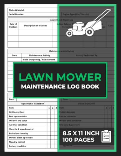 Lawn Mower Maintenance Log Book: Lawn Mower Repair & Service Record Logbook | With Daily Inspection Checklist | Mower Equipment Maintenance Forms