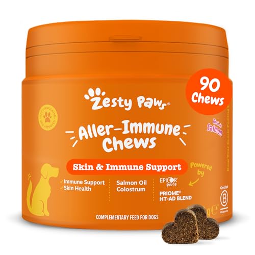 Zesty Paws Allergy & Immunity Supplement för hundar | Relief för kliande hund, Lindring av kliande hud med antihistamin | Antiklåda och hudlindring | Rik på laxolja, omega 3 och fettsyror | 90 st