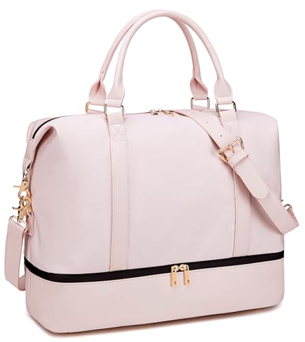 Dam resor weekendväska kanvas handbagage övernattning bagage duffel strandväskor (rosa läder svart rand med skofack), Rosa, Large
