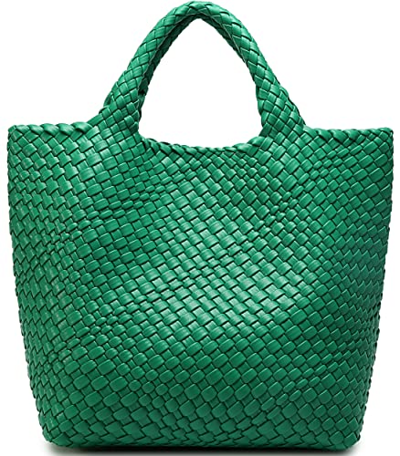 Woven Bag for Women, Vegan Leather Tote Bag Large Summer Beach Travel Handbag and Purse Retro Handmade Shoulder Bag (Forest Green)