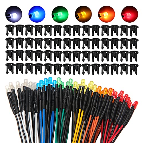 Lyeteung 60 Stycken 3mm 12V Förtrådda LED Dioder Ljus med Diffus Färgad Lins, Vit Röd Orange Gul Blå Grön, 20cm Förtrådda LED Lysdioder + 60 Stycken 3mm Plast LED Hållare