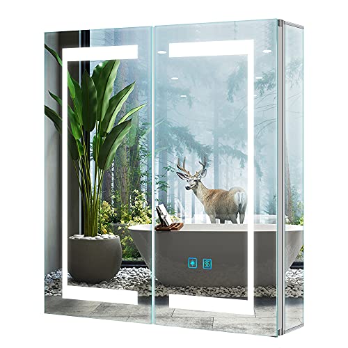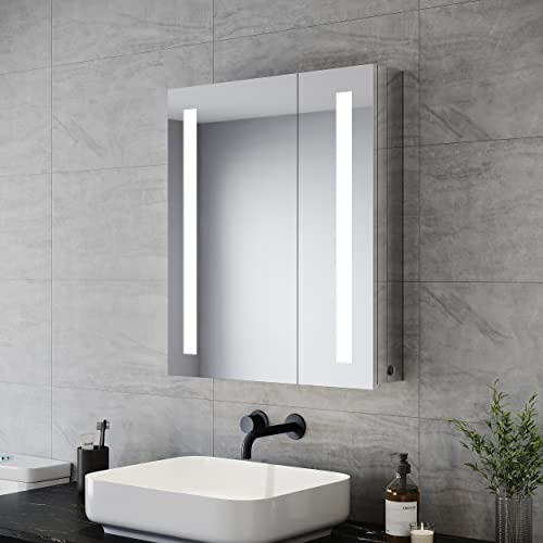 SONNI Spegelskåp badrum med belysning 60 cm brett rostfritt stål LED dubbla dörrar badrumsskåp, med uttag och vippbrytare, gångjärnsdesign, för badrum IP44 vattentät
