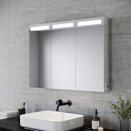 SONNI Spegelskåp med LED-belysning, 90 x 65 cm, rostfritt stål, badrum, spegelskåp med uttag och vippbrytare, gångjärnsdesign, IP44