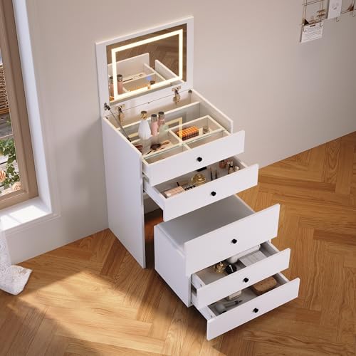 SONNI Sminkbord 3-i-1 med hopfällbar spegel, LED-belysning, synlig glasplatta, toalettbord med 4 lådor, pall med 4 universella hjul, sminkbord för sovrum, vitt, 60 x 45 x 83 cm