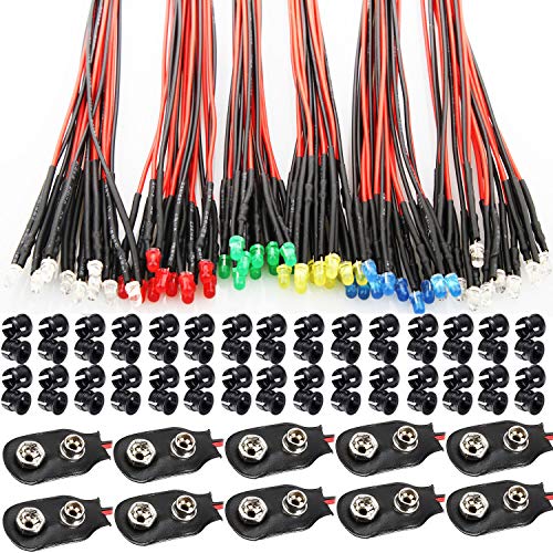 GTIWING 50 st 3 mm lysdioder med 20 cm kabel, DC 12 V förkopplade LED-dioder ljus (röd, gul, grön, vit, blå, varje10 st) 50 st 3 mm LED monteringsringar plast 10 st 15 cm 9 V T-typ batteriklämma
