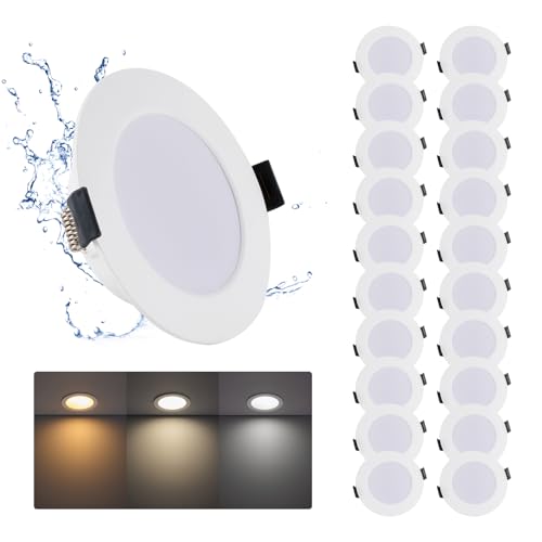 20 Pack, Led Downlight 230V, IP44 Vattentät Inbyggningsspotlight, 5W Kallvit 6000K, Badrum, Kök, Vardagsrum, Sovrum, Hål 68mm - 80mm, Diameter 90mm, 24mm Extra Platt