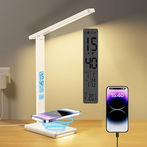 YAMYONE LED-skrivbord med trådlös laddare och USB-laddningsport, 5 färger 5 ljusstyrka dimbar ögonskyddsbord skrivbord med nattljus, LCD-skärm klocka temperatur bord