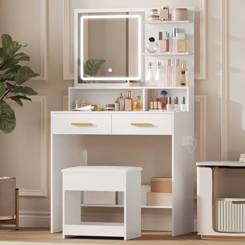 Hzuaneri Kommod med Justerbara Led-Lampor. Laddningsbart Ac-Uttag och Usb-Port, med Mjuk Toalettstol, 2 LåDor, öPpna FöRvaringsstäLl, FöR Sovrum, Garderob, OmkläDningsrum, VitDT32903X