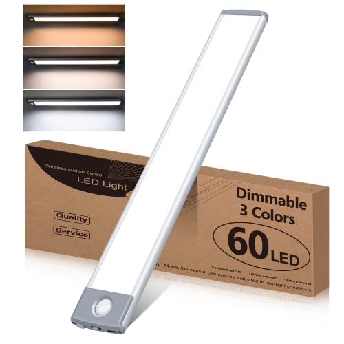 HIBOITEC 60 LED garderob 3 färgtemperaturer steglös dimning, rörelsesensor lampor inomhus, USB-laddningsbar under skåp garderobsbelysning, skåp ljus stick på kök trappor hall