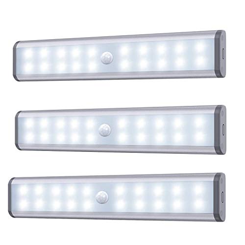 HIBOITEC Belysning under skåp 20 LED-lampor garderob, rörelsesensor trådlös magnetisk uppladdningsbar under diskbänkbelysning, batteridriven LED-nattlampa för garderobsskåp garderob, varm vit, 3-pack