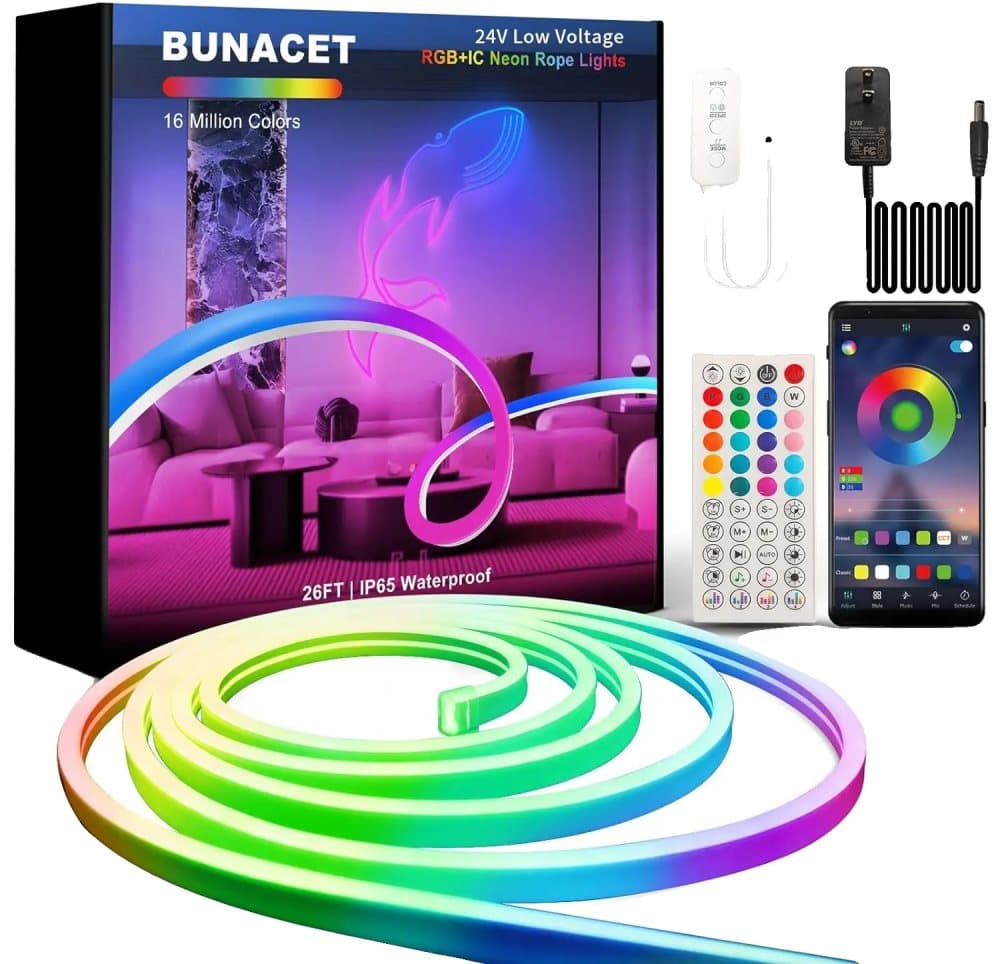 LUXONIC 6.5FT / 2M Bluetooth LED Neon Rope Lights med fjärrkontroll APP kontroll, IP65 Vattentät Flexibel Neon LED Strip Lights RGBIC LED Neon Lights för sovrum rum utomhus inredning [Energiklass A +]