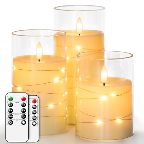 JHY DESIGN LED Flamlösa Glas Vaxljus, 3 Set Vita Fladdrande Batteriljus med 8-knapps Fjärrkontroll Timer Batteridrivna Ljus för Bröllop Vardagsrum (Flammformad Topp)