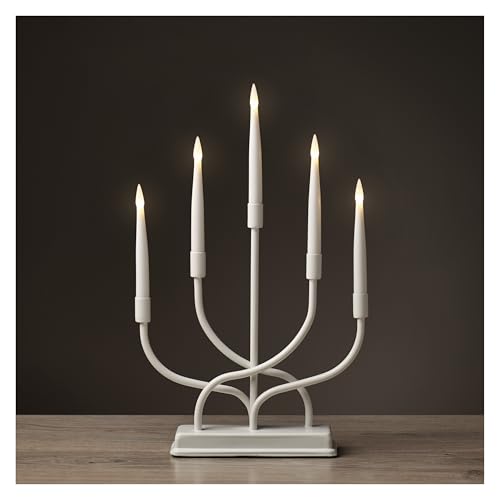 EMOS metall LED-ljusstake, klassisk, metallstativ med 5 LED-ljus, vit, batteridriven 2 x AA, inomhus IP20, 6/18 h timerfunktion, 40 x 26 cm
