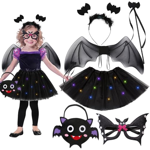 Halloweenkostym för barn och flickor, halloweenkostym för barn, flickor, LED-tyllkjol, fladdermusvingar, trollstav, hårband, mask, filtväska, cosplay, outfit, halloween, fest, 6 st