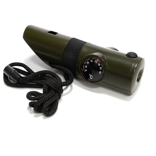 PARENCE Multifunktionell 6-i-1-kompass med termometer, LED, förstoringsglas, visselpipa och spegel - kompakt överlevnadsverktyg med sladd - armégrönt - batteri ingår