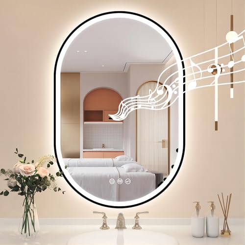 STARLEAD Svart spegel-oval-badrum-LED-ljus 90 x 60 cm, Bluetooth, anti-fog, dimbar, 3 ljusfärger, minne, härdat glas, IP44, horisontell/vertikal, icke-metallram