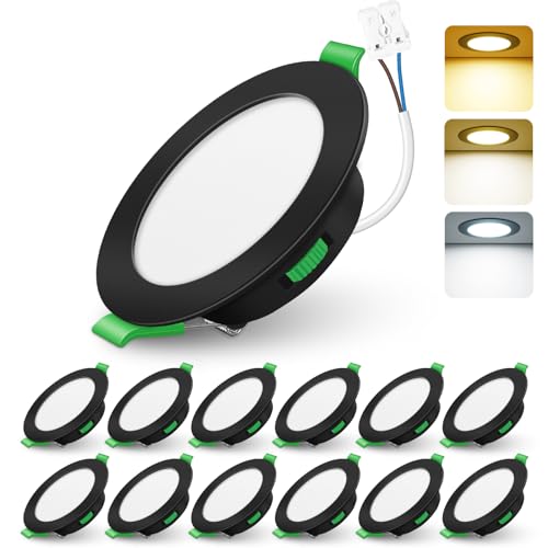 ALUSSO LIGHTING Dimbar infälld LED-spotlight, 4 W 310 lumen badrumspot IP44,3CCT 3 000K 4 000K 6 500K justerbar färgtemperatur, plats för badrum, vardagsrum, kök, set med 12, svart, rund