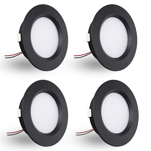 DYKUWEY Infälld LED-spotlight, dimbar 12 V LED-spotlight, 3 W extra platt infälld spotlight 14 mm, IP44 spotlight badrum hål 55 mm, takspotlights för husbil kök, set om 4 (svart varm vit 3 000 k)