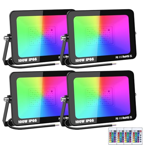 RIGIDON 4-pack utomhus RGB LED strålkastare, 100W dimbar 16 färgskiftande strålkastare för trädgård, innergård, landskap, scendekoration, IP66, elnätsdriven, fjärrkontroll, 175-265V