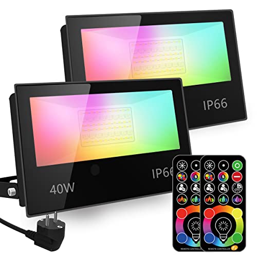 HEKEE LED-strålkastare utomhus 40 W RGBW-färgförändring, gör-det-själv-strobeläge, 120 färger, timing, strålkastare utomhus 4000 lumen, RGB 2700 K varm vit, IP66 vattentät