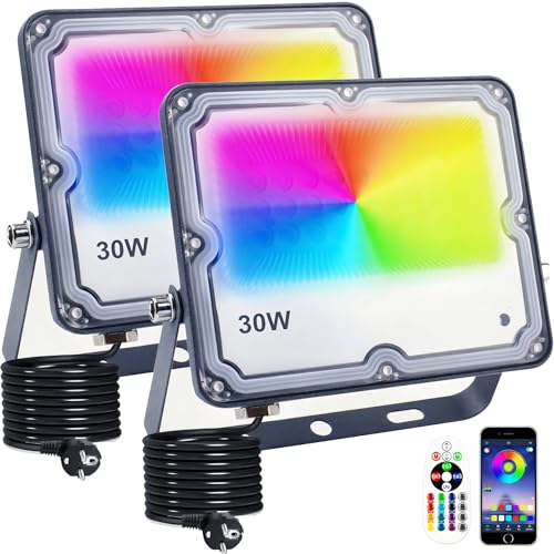 RGB LED-strålkastare Utomhus eller Inomhus 30W, IP66 Vattentät Färgad Varmvit Dimbar Strålkastare, Smart Trädgård Stämningsljus Bluetooth APP-kontroll, 300W Ekvivalent, DUSKTEC