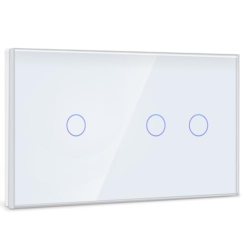 BSEED Touch Light Switch 2 Gäng 2 Vägs +1 Gäng 1 Väg, Panel av härdat glas med LED-indikator, Touch Wall Switch Vit, Ingen neutral tråd 800W