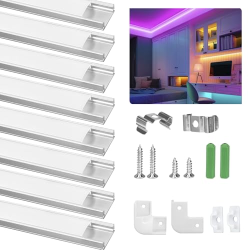 Ykall LED-aluminiumprofil, LED-profil 8 x 1 m, LED-kanaler U-form för LED-remsor, LED-list profil och diffusor för perfekt ljus, med hörnkontakter, ändlock, skruvar och monteringsklämmor