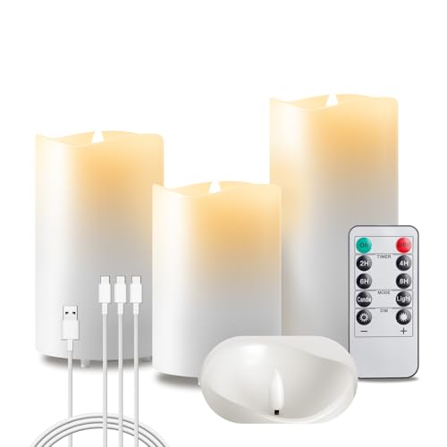 EXTSUD Flamlösa LED-ljus 3 flimrande äkta vax ljus uppladdningsbara LED-ljus med timer och fjärrkontroll 7,5 x 10,5, 13,5,16 cm blockljus för hem bröllop jul halloween festdekor