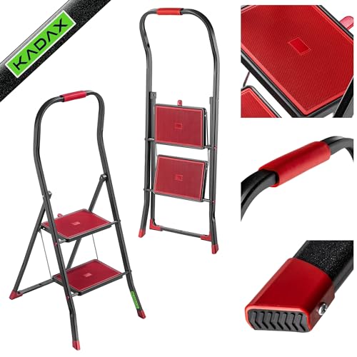 KADAX Fällbar stålstege, 2-stegs stegstege med halkfria steg, lastkapacitet upp till 150 kg, svart-röd, med viksäkerhet och ledstång