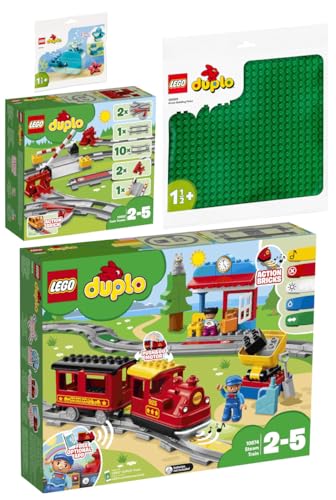 Lego Duplo Set med 4 10874 ångtåg, 10882 järnvägsskenor, 10980 byggplatta i grönt och 30648 val
