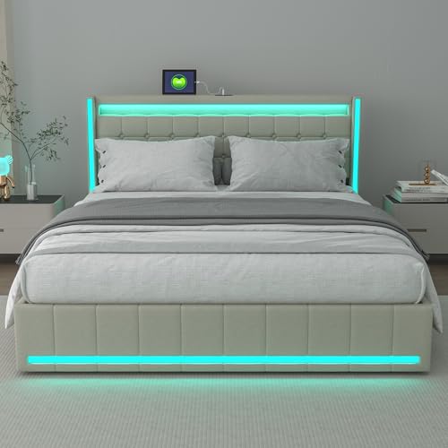 FOERPL Dubbelsäng, 160 x 200 cm, med förvaring, säng med LED-låda, 4 lådor av järn, nattduksbord med USB-laddningsport, linnetyg (typ B, beige, 160 x 200 cm)