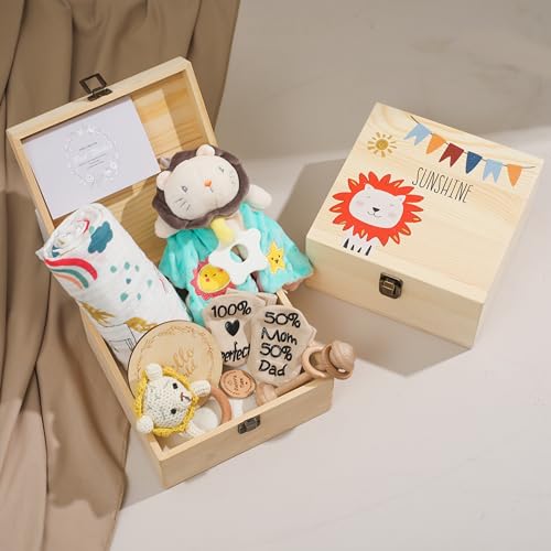 Youuys Baby gåva till födseln presentset, baby gåva pojke och flicka, trälåda baby gåva nyfödda, 8-i-1-set med muslinduk + bomull goseduk + skallra + presentkort (lejon)
