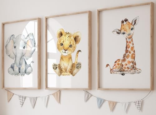 Eviepops Prints Väggdekoration Baby Safari – Set med 3 Oinramade Affischer för Barnrum Flicka/Pojke – Djur (Lejon, Elefant, Giraff) – A3