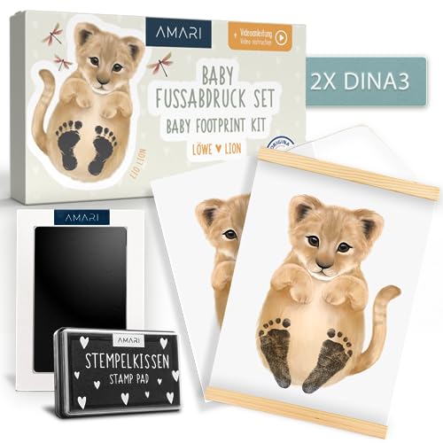 Amari ® Baby fotavtrycksset med 2 djuraffischer (motiv lejon) & Clean Touch Pad – presenter till födseln