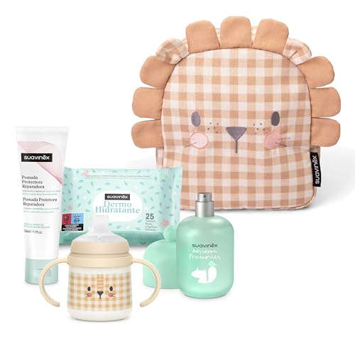 Suavinex, Barnkammarryggsäck, korg – babypresent med: Baby Cologne Memories 100 ml reparationssalva 50 ml 25-pack fuktgivande våtservetter lärande mugg, beige lejon