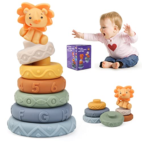 JoyPlus 7 st Stacking & Nesting babyleksaker, klämma tänder babyleksaker och byggnad cirkel med lejon figur, tidig pedagogisk jul leksak gåvor för 6 12 18 månader baby småbarn pojkar flickor