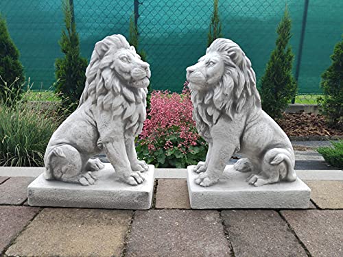 Uppsättning av två lejon, gjorda av gjuten sten, trädgårdsstatyer, prydnad, dekoration