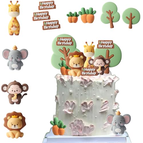 NEODTX Tårtdekoration för 1:a födelsedagen, för baby, barn och flickor, Happy Birthday-tårtdekoration med djur-, giraff-, lejon- och apfigurer, dekoration för födelsedagstårta, med skogsdjur/tårtfigur