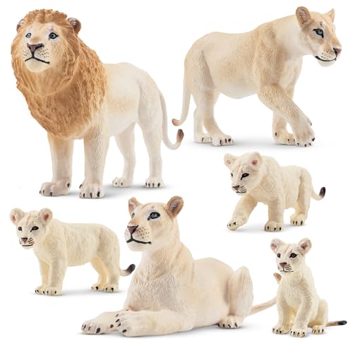 TOYMANY 6 stycken vita lejon djurfigurer med lejonbabys,lejon-leksak, plastdjur, zoo, skog, djurfigurer, djungeldjurfigurer, pedagogiska leksaks-tårttopp, för lek eller som dekoration för barn