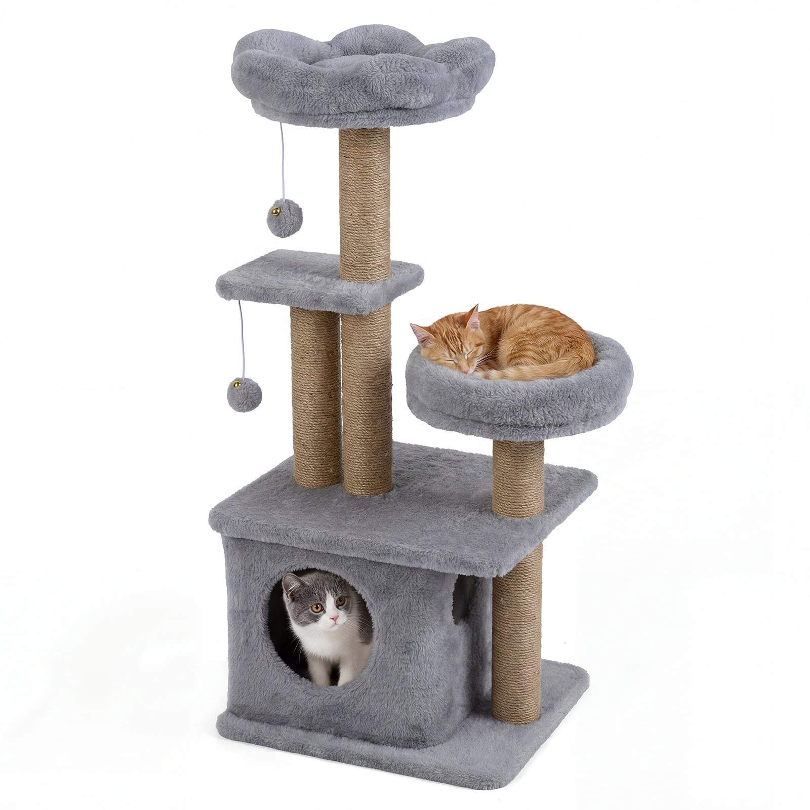 Skrapstolpe 112 cm kattträd med kattgrotta, säng, lekbollar, kattskrapstolpe med sisalskrapstolpar, för katter upp till 5 kg, be