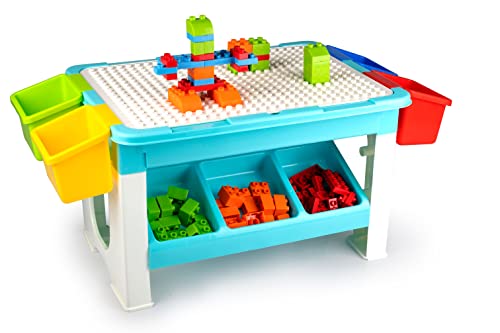 burgkidz Barn 5-i-1 Bordsuppsättning Med Flera Aktiviteter - 128 Stycken Stora Byggstenar Kompatibla Tegelleksaker, Lekbord Innehåller 1 Stol Och Byggstenbord Med Förvaring, Grön Bottenplatta (Blå)