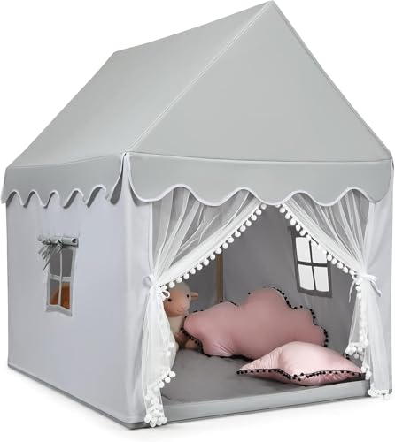 FANTASK Barntält med massiv träram och bomullsfilt, barnhus för pojkar flickor prinsessa, grått barntält inomhus, barn lekhus för inomhus, 120 x 105 x 140 cm