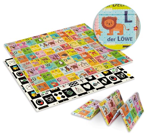HUMBI Lekmatta, krypmatta, dubbelsidig skummatta, XXL, vikbar lekmatta, stor, halkfri, båda sidor, luktneutral, XPE-skum, ABC, djur, svart-vit, kontrastbilder 120 x 180 cm